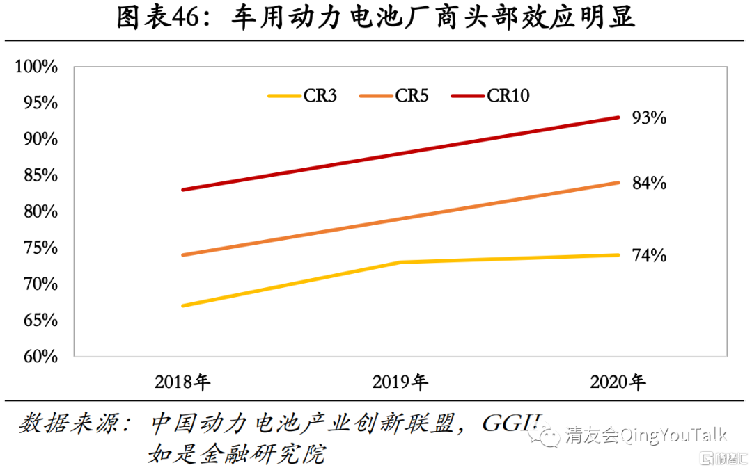 厂商竞争格局趋于稳定,头部效应明显。根据中国汽车动力电池产业创新联盟数据,2021年前三季度我国动力电池装车量前十名的企业分别为宁德时代、比亚迪、中航锂电、LG新能源、国轩高科、蜂巢能源、亿纬锂能、塔菲尔新能源、孚能科技、捷威动力。从市场集中度来看,动力锂电池装机格局向宁德时代等头部厂商与比亚迪这类自供给核心厂商集中。根据中国汽车动力电池产业创新联盟、GGII等机构数据汇总整理,2020年动力锂电池厂商市场集中度CR3、CR5、CR10分别为74%、84%、93%。其中动力锂电池厂商CR10从三年前的约八成一跃升至93%,2018年-2020年CR10分别为83%、88%、93%;2021年前三季度我国新能源汽车市场共计54家动力电池企业实现装车配套,较去年同期减少10家,CR3、CR5、CR10动力电池企业动力电池装车量分别为67.2GWh、77.0GWh和84.4GWh,占总装车量比分别为73.0%、83.6%和91.7%;随着新能源汽车行业市场化进程的进一步推进,动力电池厂商集中度逐渐提升,头部化明显,市场集中度逐步提升且进一步头部话趋势十分明显。后补贴阶段,技术壁垒与议价权优势逐步凸显,动力锂电池厂商头部化趋势将进一步确立。一是技术壁垒问题。从技术端看铁锂与三元之争愈演愈烈,随着锂电技术路径分野、制造与技术水平分层,利好头部企业发展,厂商马太效应将会进一步凸显。二是供应商管控问题。由于动力锂电池厂商头部化现象明显,头部厂商市场垄断程度较高,与上游正负极材料、隔膜甚至原材料供应商议价权更强,可实现利润空间远大于中小厂商,加剧市场竞争格局头部化趋势。