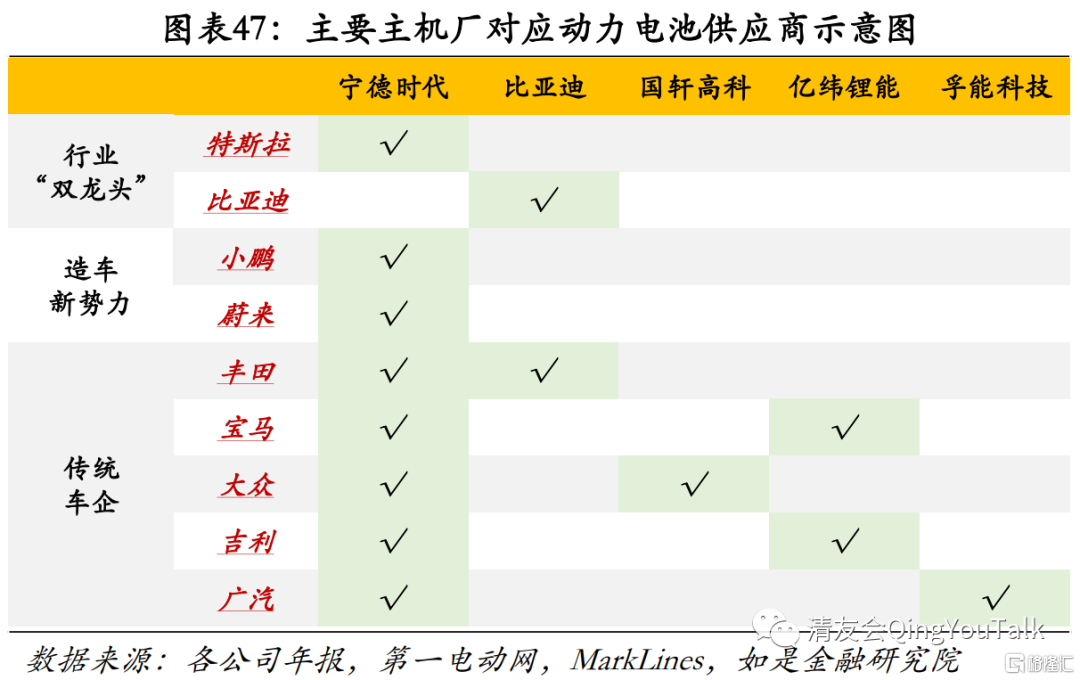 供应链端关注龙头新能源车企需求。头部锂电池厂商上下游议价权较强,但次头部厂商中、短期动力锂电池需求总量来自于下游主机厂,因此龙头新能源车企上游电池供应商基本面更加得以支撑。根据各公司年报,第一电动网,MarkLines等多方数据汇总,根据特斯拉、比亚迪、小鹏、蔚来、丰田、宝马、大众、吉利、广汽几大车企电池供应商信息,宁德时代(8家)、比亚迪(2家)、国轩高科(1家)、亿纬锂能(2家)、孚能科技(1家)五家上市公司占据市场较大份额。