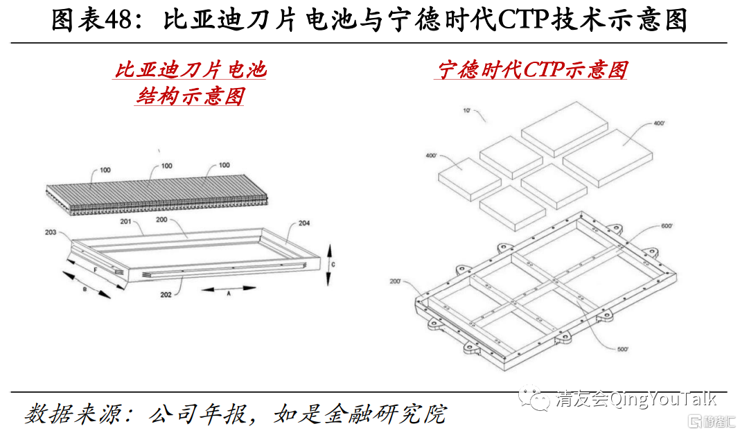 技术端关注比亚迪刀片电池技术与宁德时代CTP(Cell to Pack)技术带动企业电池装车放量。通常情况下,三元电池续航能力较强,但三元电池主要涉及原材料为钴,但钴元素主要产地来自刚果且市场处于垄断地位,受制于钴供应不稳定导致其价格较高,带动三元材料成本高企;而磷酸铁锂电池成本相对较低、安全系数更高,但受制于耐低温性较差导致冬季能量密度受损。宁德时代方案——CTP(Cell to Pack)降低三元电池制造成本。一般电动汽车上搭载的电池包,由电芯(Cell)组装成为模组(Module),再把模组组装成电池包(Pack),而CTP(Cell to Pack)是电芯直接集成为电池包,从而省去了中间模组环节,增加能量密度的同时降低制造成本。根据车研社资讯平台披露数据,特斯拉Model 3所采用的基于21700集成化大模组相对此前仅电池成本就降低了35%,宁德时代CTP技术也具有相同成效。比亚迪方案——刀片电池提成提升磷酸铁锂电池能量密度。比亚迪的刀片电池研发基于磷酸铁锂电池之上。传统电池模式多采用的是圆柱型,单体电池堆叠之后会形成较多的空隙,再除开支撑冷却以及支撑构件,最后空间利用率仅能达到40%多。扁平化的刀片电池可以缩小单体电池间的无效空隙,空间利用高达60%,能量密度得以提升,同时表面积的增大对于散热也可起到较大作用。