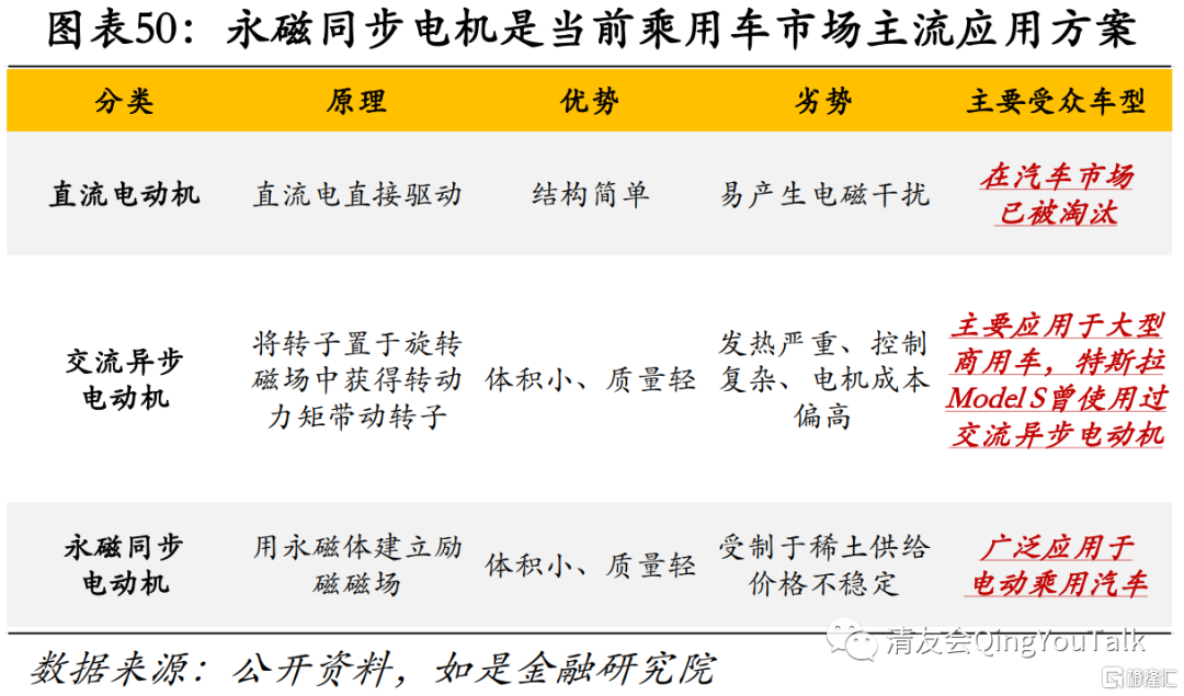 受益于本国稀土资源储备,永磁同步电机产量高、成本低,成为市场主流。从技术方案上分类,常见的电动机包括直流电动机、交流异步电动机、永磁同步电动机。其中,直流电动机是使用直流电直驱的电机,结构相对简单,具有良好的电磁转矩控制特性,但高速和大负荷运行时换向器表面易产生电火花,从而易产生电磁干扰,在电动汽车发展的早期相对常见,目前已经基本被淘汰;交流异步电机是将转子置于旋转磁场中获得转动力矩带动转子转动的电机,交流异步电机体积小、质量轻、价格较低,但在高速运转的情况下电机的转子发热严重,工作时要保证电机冷却,同时异步电机的驱动、控制系统很复杂,电机本体的成本也偏高,因此主要应用于大功率电动商用车中;永磁同步电动机是利用永磁体建立励磁磁场的同步电机,具有较高的(功率/质量)比,体积更小,质量更轻,但稀土式永磁同步电动机生产需要用到稀土材料,制造成本不太稳定。不过受益于稀土资源相对丰富,我国比较倾向于使用永磁同步电机的电动汽车驱动方案,该路径也已成为当今电动汽车应用最多的电机方案。