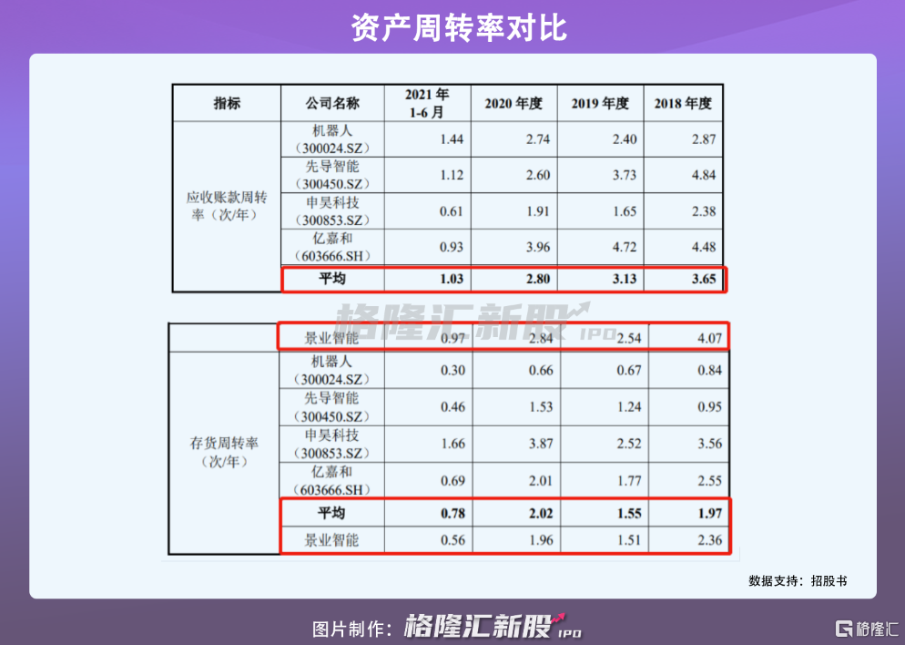从应收账款周转率来看,其呈现波动下滑趋势,从2018年的4.07降至2021年上半年的0.97;同期存货周转率也从2.36降至0.56,且二者比率均低于行业均值,景业智能现金流量承压。