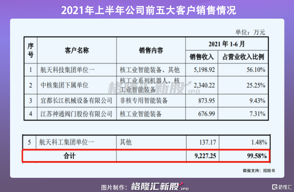 值得注意的是,因公司主要产品集中核工业领域,其前五大客户集中度较高,2018年至2021年上半年,其销售收入占营收比例分别为99.63%、99.84%、99.16%和 99.58%。
