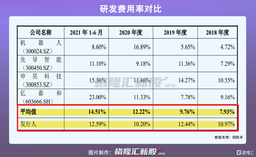 报吿期内, 景业智能加大研发费用投入,从2018年的876万元波动上涨至2021年上半年的1167万元。但因其销售规模增加,其研发费用率自2020年开始低于同行业平均值,2020年和2021年上半年分别为10.20%、12.59%,同期同行均值分别为12.22%、14.51%。