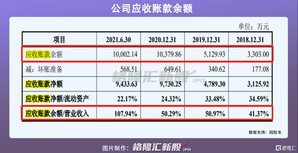 同时,因公司营业收入增长和采取分阶段付款的结算方式,景业智能应收账款余额相应增加,报吿期各期末,分别为3303万元、5130万元、1.04亿元、1亿元,占当期营收的比例分别为 41.37%、50.97%、50.29%、107.94%,占比较高。