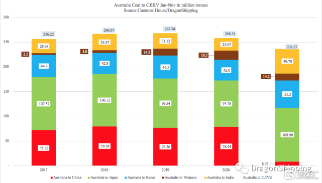 (澳大利亚对中日韩越印五国煤炭出口 1-11月份)