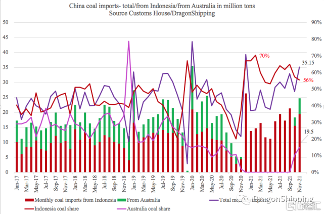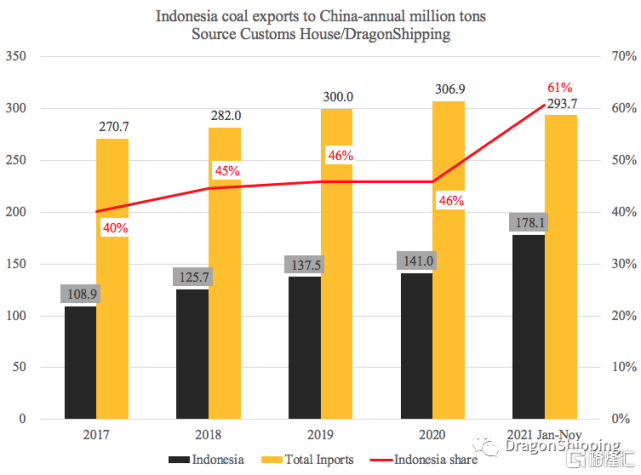 中国1-11月份共计进口煤炭(无烟、焦煤、褐煤、动力煤)2.937亿吨,而印尼则对华供应1.781亿吨,月均对华出口1480万吨,份额由2020年的46%迅速上升为61%。叠加澳洲煤炭的困境,印尼该禁令将对中国煤炭供应产生重大影响。