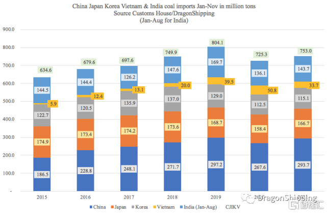 中日韩越印度五国煤炭进口占世界总煤炭海运量的65%以上,2021年前11个月(印度为各年1-8月份),共计进口煤炭7.53亿吨。