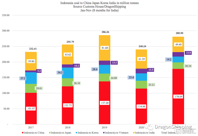 (印尼1-11月份对中日韩越印煤炭出口)