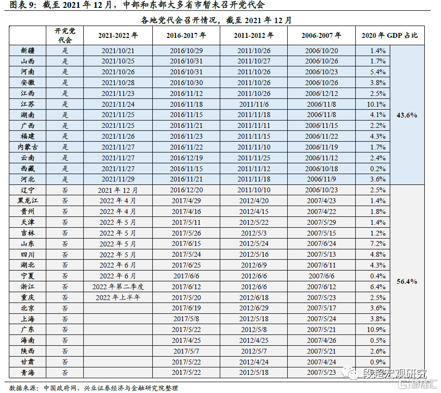 三重压力下,中央强调“稳增长”,2022年各地政策的变化值得关注。2021年中央经济工作会议同时提到“稳字当头”和“以经济建设为中心”,这也是2014年、2018年中央经济工作以来,中央经济工作会议再次强调“以经济建设为中心”,指向明年的经济工作重心为“稳增长”。从中央定调到政策落地仍需要地方政策的配套,而2021-2022年恰逢各省市党代会的召开,各省市领导班子的换届可能会对地方政策出台的节奏产生扰动。截至2021年12月,仍有大量中部、东部省份暂未召开党代会,这些省份的经济总量约占2020年全国GDP的56%。