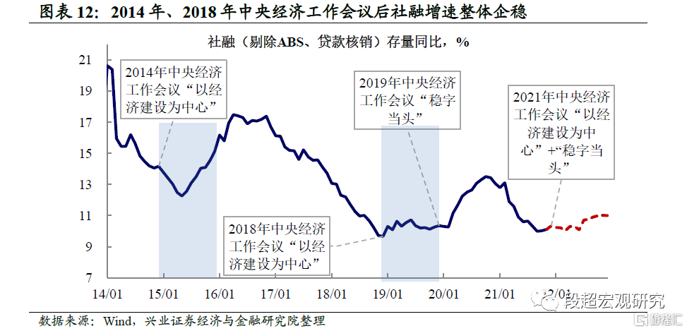 历史上“稳增长”对应经济“下台阶”时期,而后货币整体宽松、社融增速企稳。如上所述,2022年中央经济工作会议中提到的“以经济建设为中心”,曾在2014年和2018年出现过,而当时对应的经济环境正是中国经济增速面临“下台阶”压力的时期。可以看到,当“稳增长”的政策基调提出之后,货币政策整体往往较为宽松,例如2015年出现多轮降准、降息,2018年多次降准、LPR利率有所下调。与此同时,信用情况也有所改善,2014年中央经济工作会议之后,社融存量增速于2015年中触底回升,而2018年中央经济工作会议之后,社融存量增速明显企稳,稳定在10-11%左右。