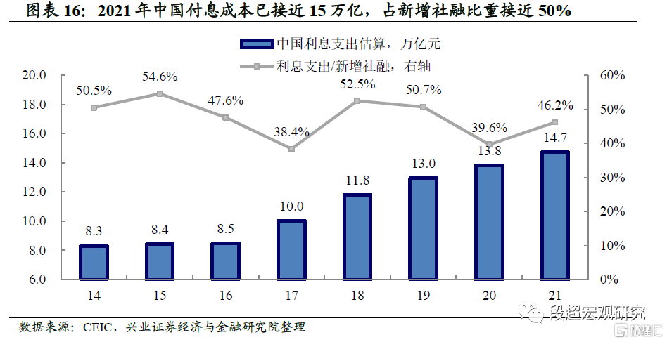 同时,存量债务问题的解决需要利率中枢下移的配合。2021年中国实体经济的付息成本接近15万亿元,约占新增社融的50%。我们在《20201028-骤雨不终日,润物细无声》中就已指出,如果要避免付息问题进一步推高杠杆率,央行通过利率中枢下移降低付息成本是一个必要选择。从存量债务的角度而言,根据我们估算,全社会付息率约有0.5-1个百分点的下行空间,对应10年期国债收益率或有0.3-0.5个百分点的下行空间。