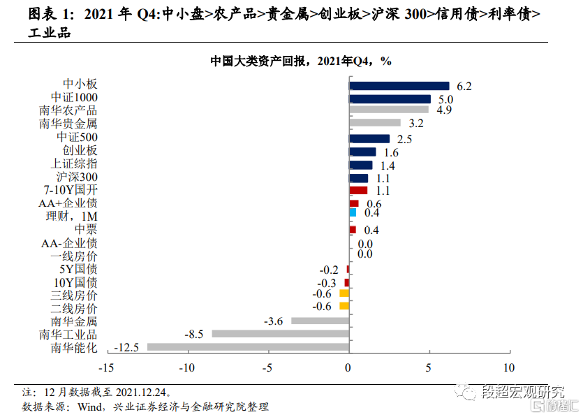 商品:2021年Q4商品表现分化:工业品先降后升,农产品、贵金属保持相对强劲。9月以来,随着“双控”目标的强调和政策趋严,各省市陆续出现不同程度的限产、限电等问题,供给端约束背景下,工业品价格走高。但自9月底起,发改委出台多个“保供稳价”政策,涉及化肥、发电用煤用气等多方面。同时,各地方也出台精准控能、减少发电企业经营压力、保障煤炭供应等多项举措。随着双控政策开始纠偏,保供稳价政策成效凸显,前期涨幅较大的煤炭、金属等原材料价格回落,带动工业品价格开始转向回落。而进入12月,在央行宣布降准降息背景下,宽信用稳增长预期有所回升,工业品价格再次上涨。另外,农产品受天气等因素影响、贵金属受通胀预期带动,均保持前期较为强劲的趋势。