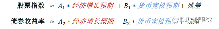 在本次报告中,我们尝试从大类资产的角度去对市场预期反映进行衡量。具体而言,股票指数与经济增长预期正相关,同时与货币宽松预期正相关;而债券收益率与经济增长预期正相关,同时与货币宽松预期负相关。因此,在经过系数调整之后,股票指数+债券收益率更能体现经济增长预期,而股票指数-债券收益率则更能显示货币宽松的预期。
