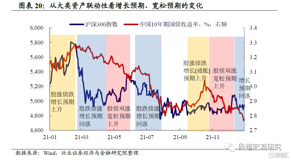 以2021年为例,大类资产表现显示货币宽松是主要线索,且全年有两次增长预期反复。2021年年初,大类资产表现呈现股涨债跌,反映了2020年底经济增长乐观预期的延续。但在春节之后,经济“挖坑填坑”效应逐渐消退,市场对经济增长的担心上升,股跌而债涨。而在4月-6月份,货币宽松的预期上升,股债双双出现上涨。2021年9-10月,“双控”政策下增长预期(通胀预期)快速上升,市场呈现股涨债跌。“双控”政策调整后,10月份至今经济增长预期回落,市场宽松预期上升。