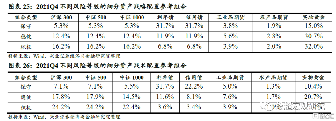 2021年Q4各资产收益率都表现较好,保守、稳健和积极战略配置组合的收益分别为2.00%、3.23%和3.91%,保守、稳健和积极战术配置组合的收益分别为1.80%、3.33%和4.65%。下图表回顾了2021年Q4策略的表现以及不同风险等级的细分资产配置参考组合。
