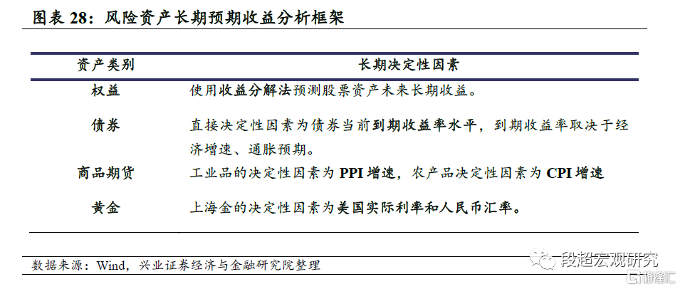 下表给出了不同大类资产长期预期收益的分析逻辑框架,包括影响大类资产长期收益的决定性因素,以及相应的动态调整项目。我们基于历史数据将决定性因素和资产滚动收益率进行分解或回归建模,并基于当前环境下的宏观状态预判,给出各资产长期收益的估计。