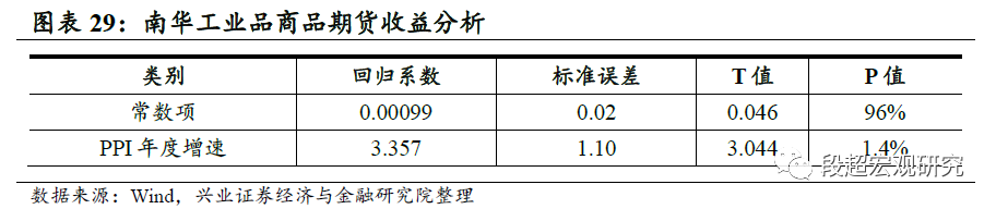 对于债券、工业品期货以及我们也尝试使用回归模型对资产收益变化进行解释和预测,以工业品商品期货为例,我们将PPI年度同比增速作为解释变量,对工业品商品期货的当年收益进行回归分析,可以看到解释变量的T值超过3,回归模型R2达到50%,因此我们可以结合对未来中长期PPI增速预判给出预期收益值。