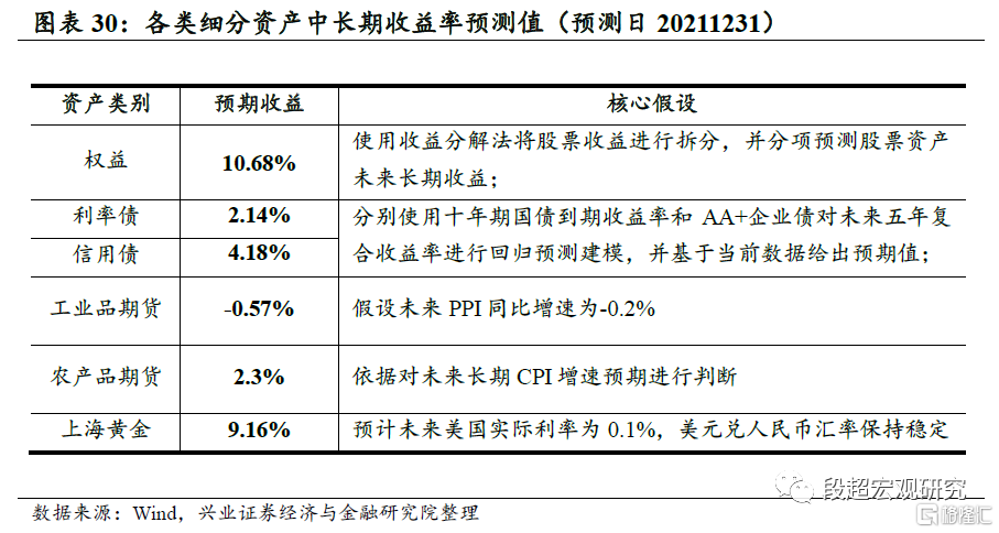 由于篇幅限制,我们将不逐一介绍各大类资产长期收益的建模过程,下表展示了我们对各细分资产未来五年的年化符合收益预测结果,以及预测过程中使用的核心假设情况。