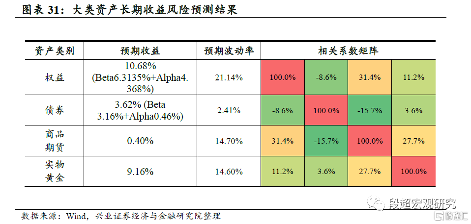 最后,考虑到资产波动率的延续性较强,我们基于各类资产长期的历史月度收益率汇总计算了资产的历史长期波动率和相关系数矩阵,作为对未来长期风险指标的预测。从波动风险来看,权益资产大于商品大于债券;从相关系数矩阵来看,债券资产能够有效分散权益资产的下行风险,商品期货能够有效分散债券资产的下行风险,而实物黄金则跟传统股债资产都保持较低相关性。