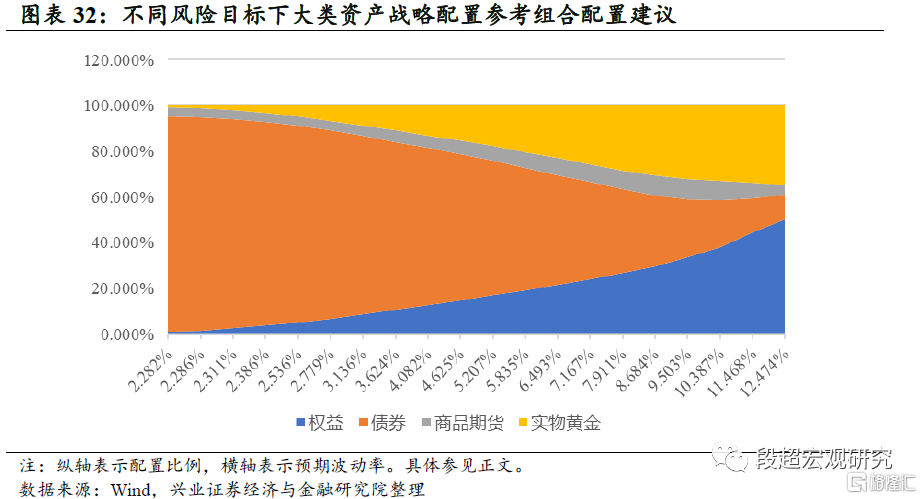 在对一级大类资产收益风险预测的基础上,我们结合重抽样均值方差模型[1]给出了不同风险约束下,大类资产的建议配置比例。随着组合目标波动率的提升,权益资产的配置比例逐步提升,债券资产的配置比例明显下降,商品类资产中实物黄金的配置比例高于商品期货,主要在于黄金对权益资产的分散化效果优于商品期货。