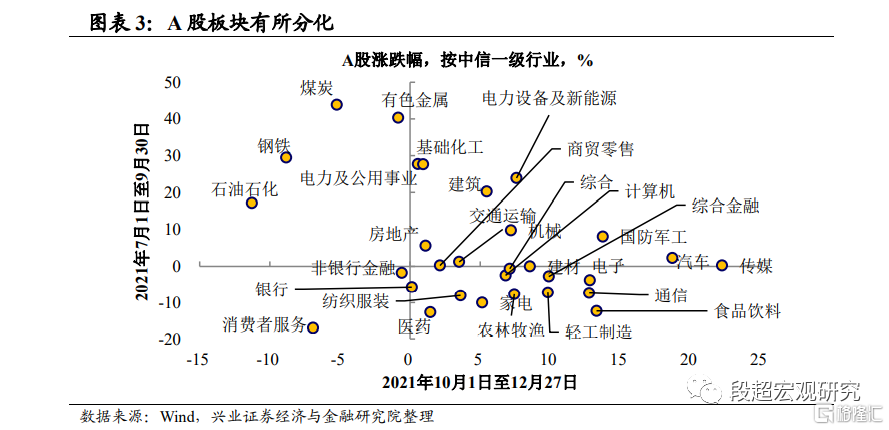 股票:向中长期政策过渡,板块有所分化。2021年Q4,权益市场各主要股指基本均录得正增长,板块则有所分化:消费行业先下跌后有所修复,周期行业下跌后小幅震荡,金融行业则震荡下跌。我们持续指出在经济增速逐渐向新平台回归过程中,经济结构调整也将带动行业利润分配发生变化。在此背景下,金融市场也开始重新审视中长期政策逻辑的变化,进而引发了换仓和波动。同时,近期经济基本面、政策指引也对市场产生了影响,经济下行压力仍存叠加双控政策纠偏背景下,周期资源品板块自9月回落后表现一般,而自11月中旬央行三季度货币执行报告定调货币政策“以我为主,稳字当头”起,“稳信用+宽货币”预期上升,周期行业则出现了小幅修复。