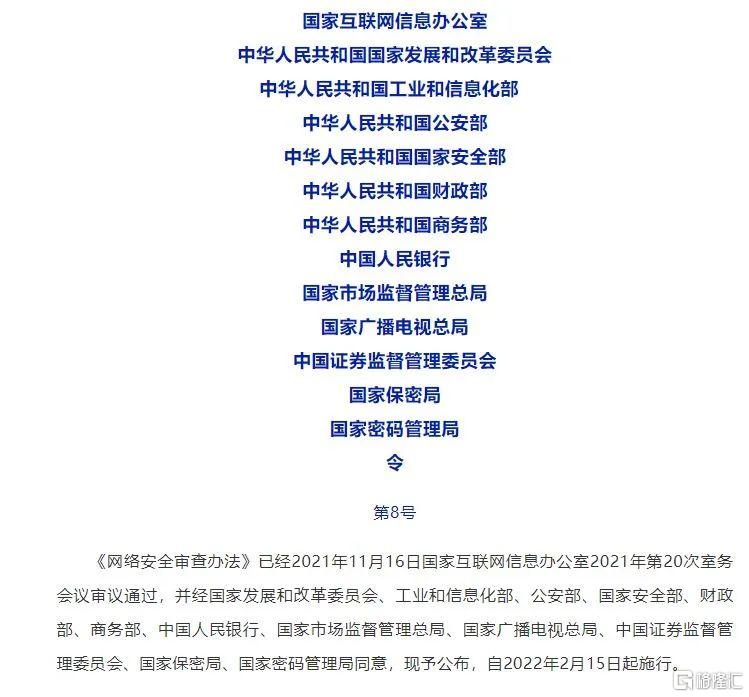国家网信办和发改委等13个部门联合修订发布《网络安全审查办法》,并将于2022年2月15日开始实施。