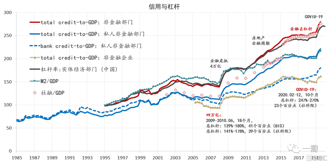 第三,前期刺激政策消化期。大危机之后,外需急剧收缩。2008年中央经济工作会议出台了“四万亿”计划,推动中国经济在2009和2010年逆势上行,也为全球经济复苏都做出了重要的贡献。但也正是在此期间,中国走上了一条高债务杠杆驱动的增长之路(图2)。根据社科院的数据,从2007年底到2019年底,中国实体部门杠杆率从145%增加到了247%,非金融企业部门从96%增加到了152%,均处于世界前列。2012年,中国GDP增速首次跌破8%,相比2007年下降6.3个百分点。2013-2015年之所以能维持在7%以上的增速,房地产和基建投资发挥了重要作用。