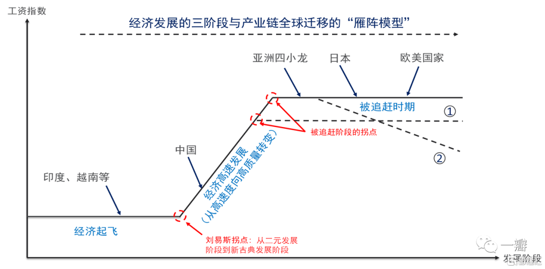 第Ⅲ阶段为被追赶阶段。刘易斯拐点叠加老龄化,劳动力短缺状况更加严峻,但是,工资上升遇到瓶颈,因为劳动密集型产业要么会选择外迁,要么会选择用资本替代劳动。随着城市化和工业化的完成,可投资的机会变得稀缺,资本回报率不断下降。该阶段,供给侧而非需求侧是经济增长的主要约束,并且,只能靠新科技革命才能扭转经济增长停滞的状况。如果仅仅从速度和质量这两个维度来划分的话,前两个阶段的共同特点是高速度,第Ⅲ阶段更加注重发展的质量,其中,第Ⅱ阶段也可以被理解为从高速度向高质量发展的过渡阶段。