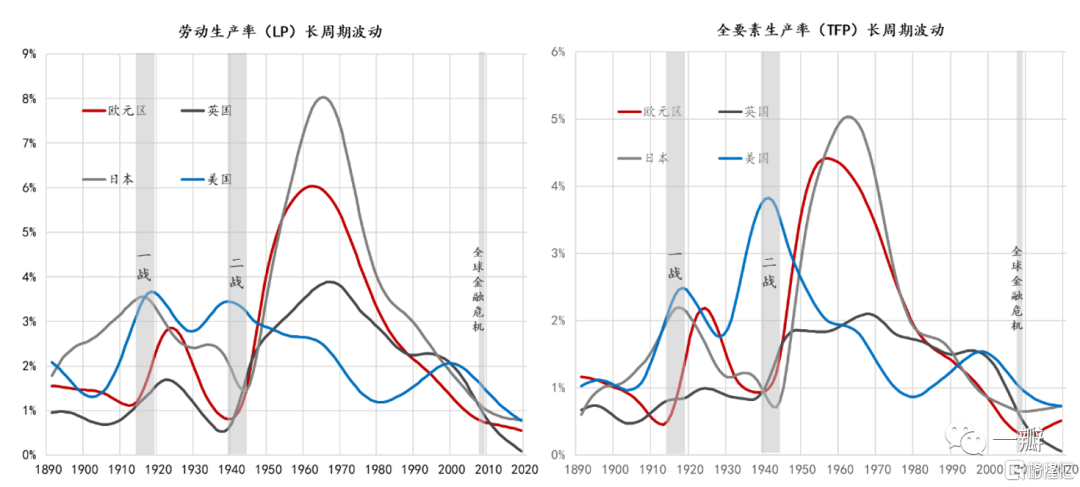 一般可以从LP或TFP的水平或长周期波动的次序大致判断自主创新的领导者和模仿者。英国毋庸置疑是第一次工业革命自主创新最主要的领导者(图4)。1870-1914年,自主创新的主要生产者是英国、美国、法国和德国,日本是模仿者。1919-1939年,自主创新主要来源于美国和法国;二战结束之后,大多数创新都是来自美国,其后才是英国和斯堪的纳维亚国家,法国、德国和日本都是模仿者。具体而言:(1)1945-1972年期间,美国、英国和斯堪的纳维亚国家的自主创新水平高于欧洲大陆国家和日本,说明欧洲大陆国家和日本生产率的提升主要来自对世界科技前沿的追赶而非自主创新。还可以得出,战后经济的非凡增长是自主创新和创新在全球的扩散共同作用的结果。(2)1972-2012年的情况有显著差异。自主创新和引进创新同步下行是全球TFP增速的下降(2%)是的重要原因。70年代全球经济增长的停滞可部分由自主创新在全球性范围内的停滞来解释。80年代后,美国和英国的自主创新进程温和回升,法国、德国和意大利则趋于下行。美国仍然是自主创新的领导者,但冲击的绝对量和对其他国家的外溢效应都明显下降。