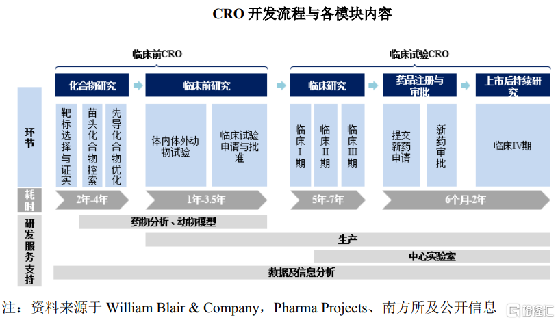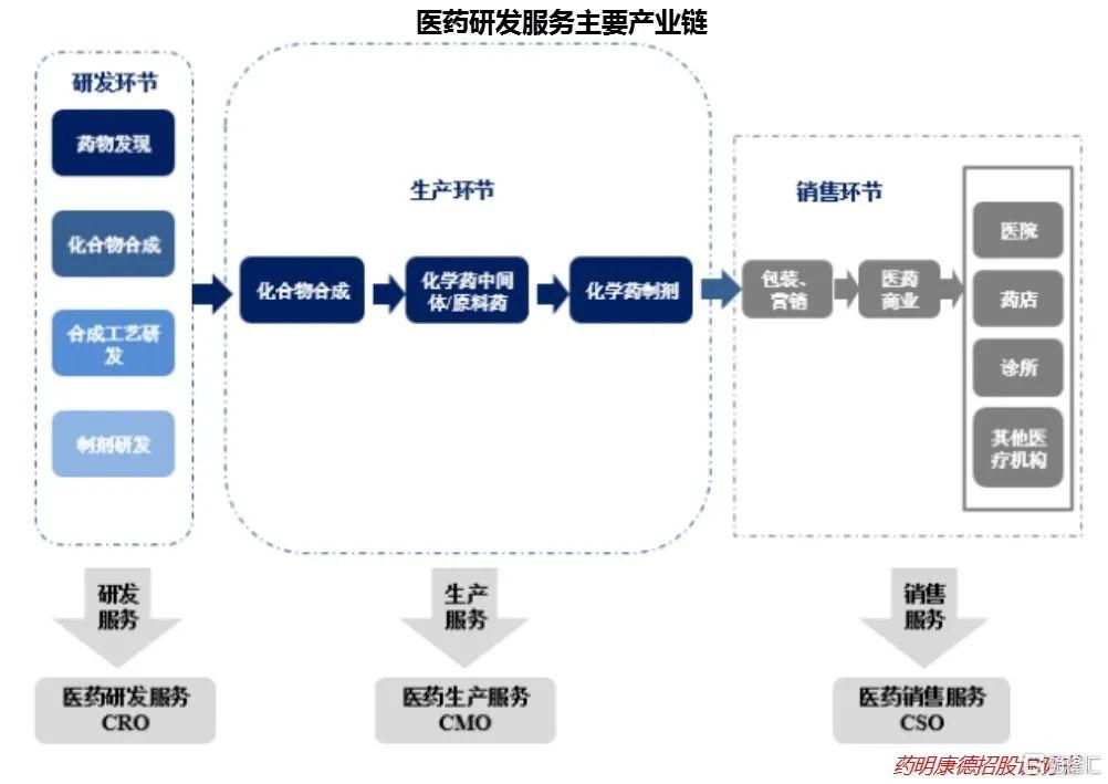 根据新药研发服务阶段的不同,医药研发服务一般分为合同研发服务(CRO)、合同生产业务/合同生产研发业务(CMO/CDMO)和医药销售服务(CSO),分别对应新药研发领域中的临床前研究(药物化合物筛选及研发、数据采集分析等)、临床研究、定制化生产及研发服务、医药销售服务等产业链不同环节。在资本市场中,被统称为CXO企业。