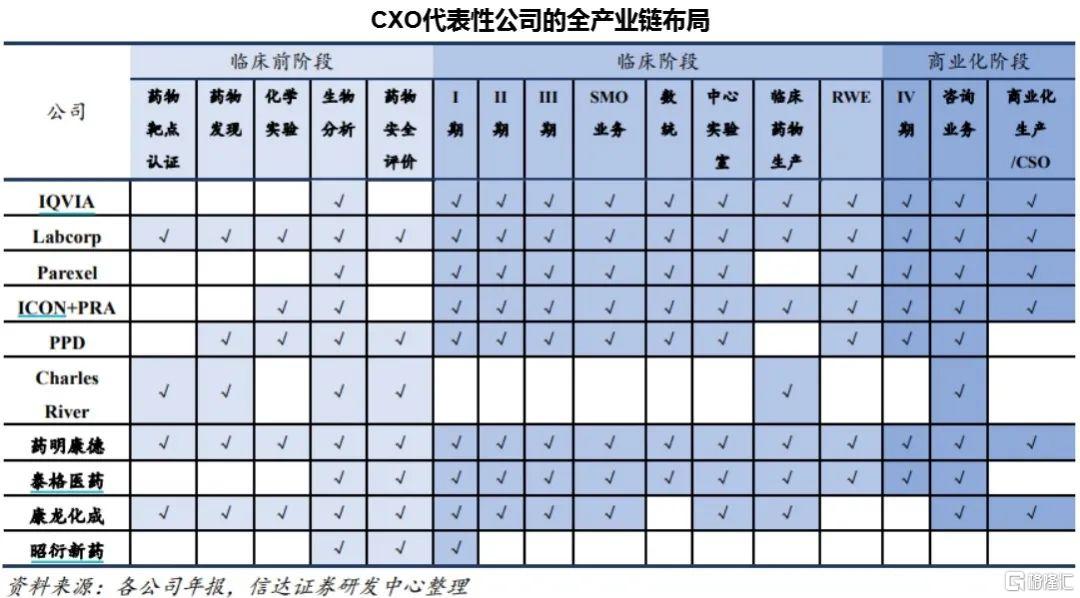 四是平台化发展,强者恒强。现阶段,CXO行业出现了平台化发展趋势,即为了给药企客户提供一揽子、全流程服务,提高综合竞争力,医药研发服务企业普遍加快全产业链布局速度,平台化发展成为行业趋势,强者恒强。