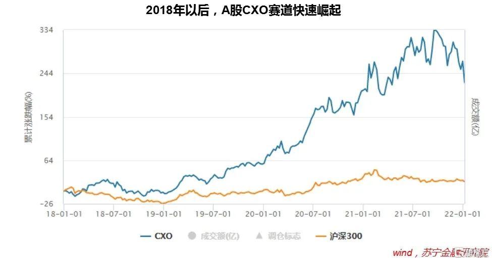 2018年以来,CXO赛道在A股市场逐步变得炙手可热。以中证医药研发服务指数(931750.CSI,简称CXO系数)为例,自2017年末至今(2022.1.7),累计涨幅达225%,年化涨幅高达35%。