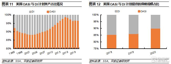 OASDI为政府强制性计划,财政承担兜底责任;其中OASI计划占比大,DI计划领取人数逐年下降。美国第一支柱公共养老金计划为政府强制参保,资金主要来源于社会保障税,税率由社会保障署依据人口老龄化预测数据和养老金支出需要进行动态调整,2021年OASDI雇员和雇主缴费比例分别为6.2%;资金收不抵支时,财政承担最终兜底责任。但人口老龄化加深、财政兜底能力有限,第一支柱发展存在局限性。具体来看,OASI计划(针对退休工人及其家属和已故工人遗属)缴费比例5.3%、缴费限额约7000美元,DI计划(针对残疾工人及其家属的遗属)分别0.9%、1240美元。随着人口老龄化程度的逐步加深,OASI的资产总额、提供的保障规模逐步高于DI——2020年OASI资产总计2.8万亿美元、在OASDI中占比97%;提供的保障规模9524亿美元、在OASDI中占比90%。随着老龄化矛盾逐渐加深,公共养老金计划运作状况出现危机,2021年OASDI年报显示,中性假设下,OASDI计划预计将在2034年耗尽,彼时将维持78%的给付率。