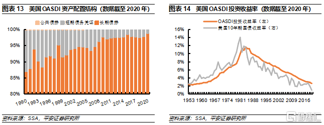 第一支柱资产的投资结构单一、以政府长期债券为主,收益率走势与国债保持一致。社会保障税集中收缴后,将专项进入养老保险管理机构——美国社会保障署(SSA)设立的社会保障基金,基金账户在留足一定时间的给付金额后,剩余资金会进行投资。根据社会保障法案,信托基金只能投资于联邦政府为其发行的特殊证券和公开发行的政府债券,其中特殊证券包括短期债务凭证和长期债券两种。总体来看,OASDI基金集中投资于长期债券,投资收益率与国债收益率走势基本保持一致。