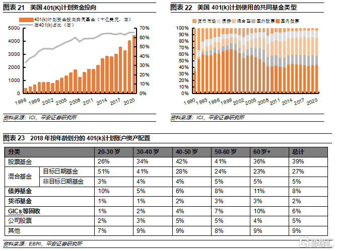 资产配置:共同基金为401(k)主要配置方向,股票型和混合型基金总体配置比例高。据Brightscope统计,大多数401(k)计划提供国内股票基金、国际股票基金、国内债券基金、国内债券基金、货币型基金、目标日期型基金[ 目标日期型基金:预先设定退休时间,在此基础上适时调整资产配置,为401(k)计划提供更灵活的投资选择。如LifePath基金2035,在退休前会更多的配置股票等权益类产品,投资目标以资产增值为主,随着时间逐渐临近2035年这个目标日期,投资当中会逐步减少权益类资产比重,而同时增加固定收益类、现金类资产投资比重,使基金风险逐渐降低,更好地匹配临近退休的投资者的资金安全。2020年目标日期型共同基金资产总额1.6万亿美元,其中DC计划占比67%、IRAs占比18%。]和指数基金等投资选择,其中共同基金是401(k)计划的主要配置方向;而目标日期型基金则为401(k)计划提供更灵活的投资选择,401(k)计划亦是美国目标日期型基金发展的重要资金来源。截至2020年末,401(k)计划投向共同基金的资产占比65.7%,其中国内股票基金、国外股票基金和混合型基金占比累计达86.3%(分别44.3%、14.2%、27.7%)。分年龄来看,中青年偏好股票型基金和混合型基金,中老年人风险偏好低、更倾向投资固收类资产。
