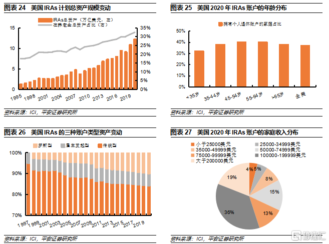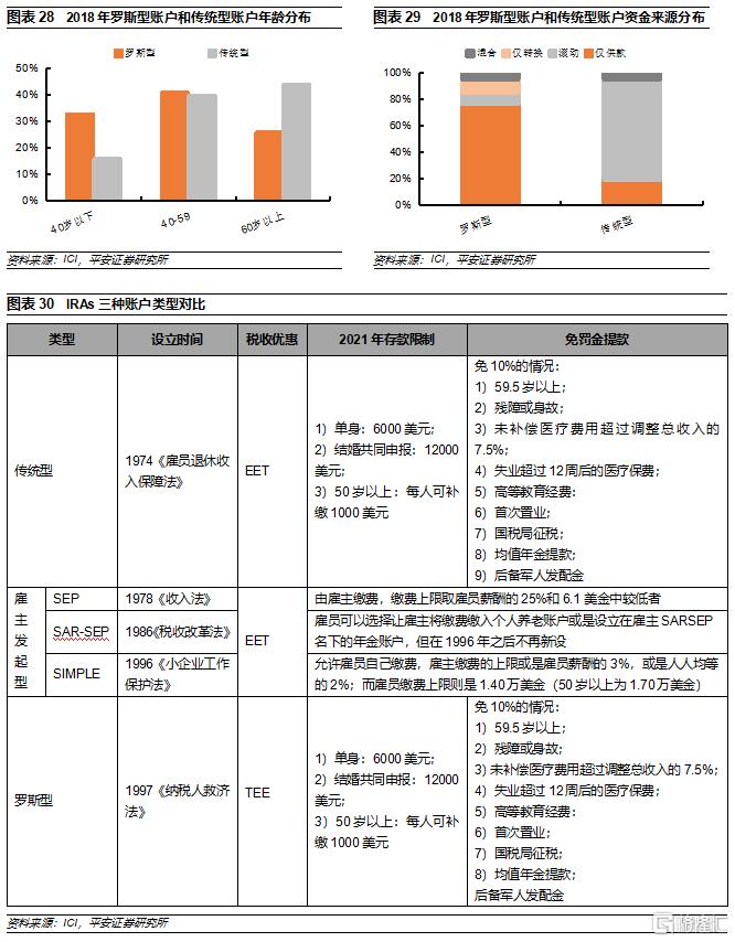 缴费与领取条件:账户设置灵活,与401(k)账户联动性强,不同账户在缴费和提款设置等方面存在差异,满足多类型投资者需求,但提前取款或面临税收处罚。具体来看:1)传统型账户存款可抵税;2)罗斯型账户可免税提取收益;3)雇主发起型存款限额最高。其中,罗斯型账户参与者较为年轻。除59.5岁以上、残障、身故等情况外,参与者从IRAs账户中提款要接受10%的罚款,传统型账户70.5岁之后必须领款、且提款时缴税,否则也会受到相应的税款处罚。而罗斯型IRAs账户没有缴费年限限制,当期缴税,在持有规定期限后提款不缴税。年轻的雇员处于职业生涯开始阶段,大部分处在低税率阶层,当下减税吸引力不大,反而更愿意在以后享受免税,因此罗斯型IRAs账户对年轻参与者吸引力更大。若提前退休,罗斯型账户还可以用来支付部分意外费用,如房屋维修或购买新车等。截至2018年末,33%的罗斯型账户投资者不到40岁,而44%的传统型账户投资者超过60岁。年龄分布差异使不同账户的资金来源构成差异较大,罗斯型账户主要依赖个人直接缴费,而传统型账户的滚动占比更高——截至2021年6月,57%的传统型账户参与者表明账户资金来源于雇主养老金计划。