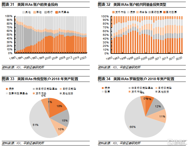 资产配置:共同基金为主要资金流向、且国内股票型基金配置比例高,投资偏好受年龄和账户类型影响。共同基金是IRAs账户资金的主要流向,但近年来共同基金在IRAs总资产中占比逐年下降,现已从2007年的51%下降到2020年的45%,资金配置逐渐多元化。从IRAs账户的资金投向来看,截至2020年末,共同基金占比45%,银行等机构存款6%、寿险4%、其他资产45%。从IRAs账户持有的共同基金类型看,截至2020年末,IRAs资产配置类型为国内股票42%、国际股票14%、混合型基金19%、债券17%、货币市场7%。同401(k)参与者一样,年龄和不同账户类型配置偏好不同。根据EBRI,年轻IRAs及罗斯型账户投资者倾向于投资股票,而老年及传统型账户投资者倾向于投资债券基金等。截至2018年末,从传统型账户来看,30岁-40岁投资者54.6%的资产投资于股票,25.2%的资产投资于目标日期型基金;60岁-70岁投资者48.6%的资产投资于股票,19.4%的资产投资于债券;从罗斯型账户投资者来看,30岁-40岁投资者62.5%的资产投资于股票,24.7%的资产投资于目标日期型基金;60岁-70岁投资者64.6%的资产投资于股票,14.9%的资产投资于非目标日期型基金。