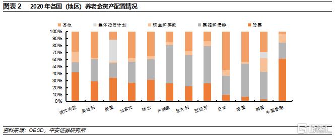养老资产配置各异,多以权益类资产配置为主。中国香港和澳大利亚养老资产以权益类资产配置为主,2020年权益类资产配置比例分别61.4%、41.8%;卢森堡、德国、意大利、西班牙等国家以固收类资产(票据和债券、现金和存款)配置为主,2020年固收类资产配置比例均在40%以上。美国则以集体投资计划为主,占比32.0%,日本其他投资占比高达55.5%(包括贷款、土地和建筑区、未分配的保险合同、对冲基金、私募股权基金、结构化产品、其他共同基金和其他投资),主要由于对证券的对外投资占总资产比例高达30.0%。