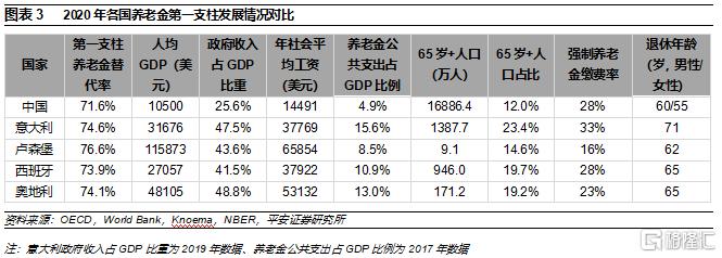我国第一支柱发展空间有限。2020年我国第一支柱总参保人数达9.99亿人,覆盖率高达86%,养老金替代率71.6%,仍低于意大利、卢森堡、奥地利和西班牙等第一支柱发达、基本养老金水平高的国家。其中,意大利第一支柱养老金替代率高达74.6%,第一支柱占GDP比例高达15.6%,主要由于政府为维持第一支柱高养老金替代率无限兜底责任,积极扩大覆盖范围,降低退休要求等。据《影响养老金替代率水平的制度因素分析》、《养老金替代率影响因素及其优化问题研究》等相关学术研究,国家基本财政状况、经济发展水平、社会平均基本工资、退休年龄、强制养老金缴费率均为影响养老金替代率水平的重要因素。我国政府收入占GDP比重仅25.6%、人均GDP仅10500美元、年社会平均工资仅14491美元,同时我国男性退休年龄为60岁,女性为55岁,均低于意大利等国家。总体来看,由于我国老年人口基数大,政府无限兜底难度极大,难以达到意大利等第一支柱发达国家的养老金替代率水平,第一支柱发展空间有限。