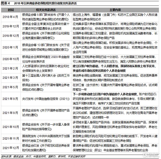 第三支柱商业养老险大有可为。我国第一支柱、第二支柱发展有限,第三支柱商业养老险亟待发展补充。同时第三支柱为高收入人群的个人养老提供渠道,给新业务从业人员、多种方式从业人员提供商业养老保障,且政策利好第三支柱发展,第三支柱发展前景广阔。截至2021年10月底,共有23家保险公司参与个人税延型养老保险试点,累计保费近6亿元,参保人数超过5万人;专属商业养老保险累计保费约2亿元,承保人数超1.7万人。我国第三支柱总体规模仍较小,但2021年以来,监管层发言频繁提及促进医养康养相结合、建立以账户制为基础的个人养老金制度,我们认为,未来仍有较大发展空间。美国是全球第三支柱最为发达的国家,本专题重点分析美国养老金三支柱体系,以邻为鉴,促进我国三支柱养老金体系发展。