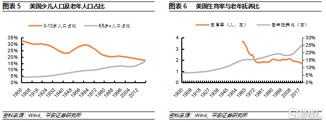 发展背景:老龄化问题愈趋严重,养老保障体系面临巨大挑战。美国早在20世纪40年代就已进入人口老龄化社会,人口老龄化现象不断深化,人口结构呈现少儿占比下降、老年占比上升的趋势,同时生育率下滑显著、老年抚养比快速提升。