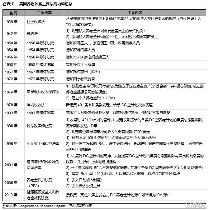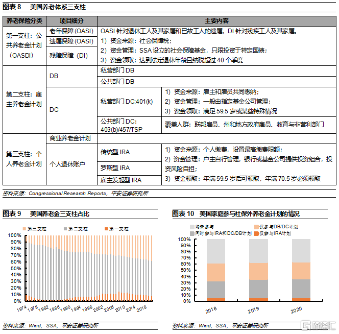 发展历程:养老保障制度不断完善,逐步形成三支柱养老保险体系。美国现代化养老保险制度始于1935年颁布的《社会保障法》,之后社会保障法案覆盖范围不断扩大,成为美国覆盖范围最广的养老保障制度。私人养老金计划同步发展,1920年联邦政府为其雇员制定私人养老金计划,20世纪70年代私人养老金相关法律陆续出台,IRA与401(k)迅速发展,美国逐步形成三支柱养老保险体系。