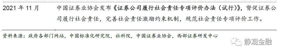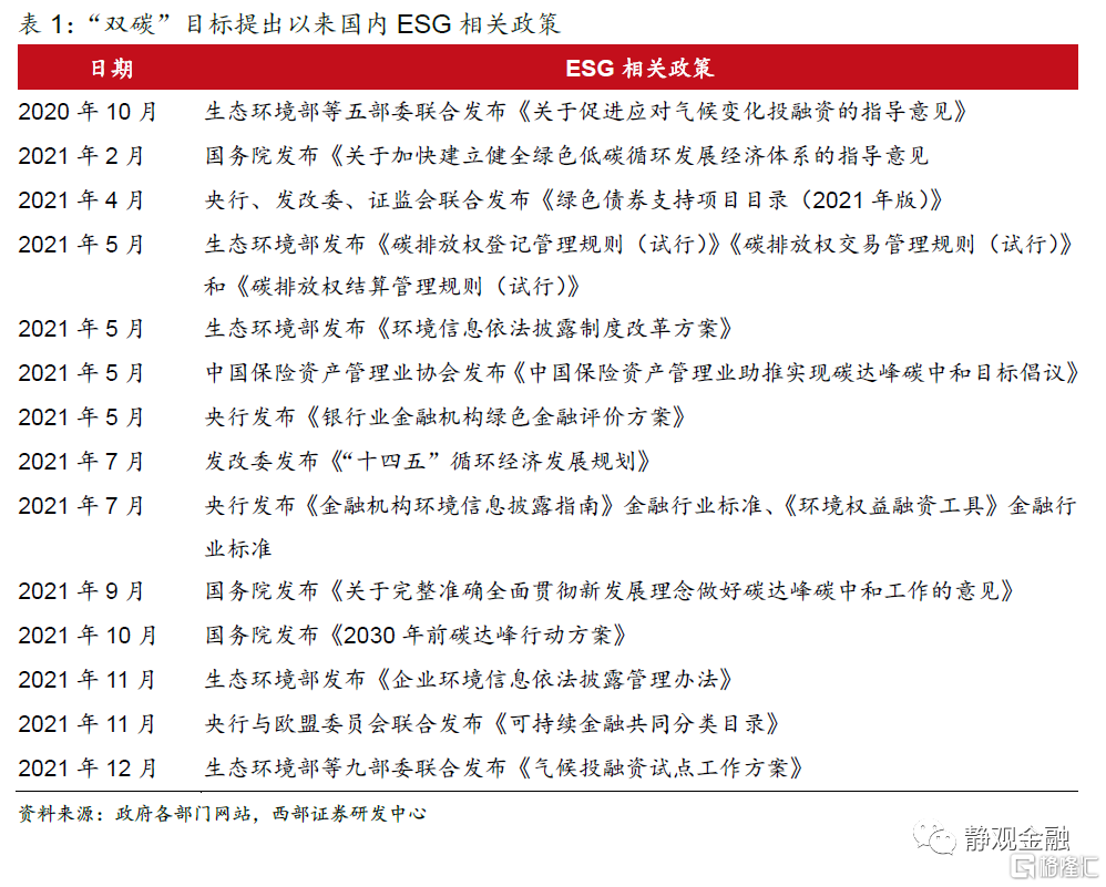 “双碳”目标推动下,ESG概念在我国地位快速提升。虽然ESG投资概念早在2004就已由联合国环境规划署提出,但我国的ESG投资在“3060双碳”目标提出后才实现突破。2020年9月我国正式提出2030碳达峰、2060碳中和的目标;此后一系列低碳节能、新能源转型的相关政策陆续出台,推动产业结构升级,加强企业碳排监管,ESG因素对于证券发行主体的影响越来越大。