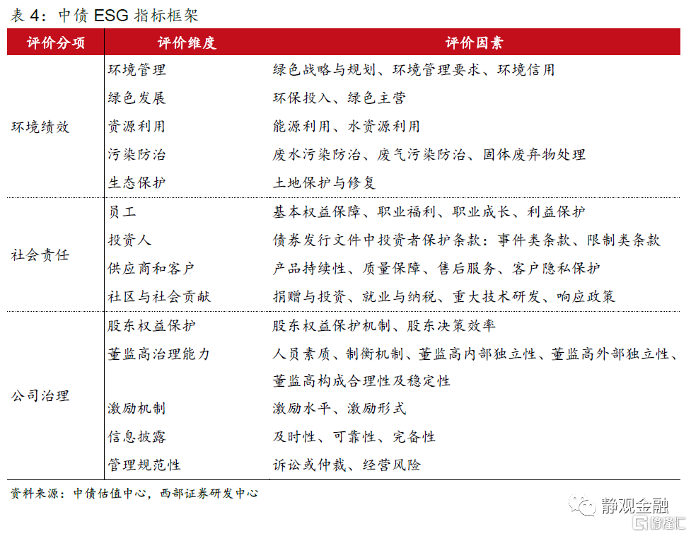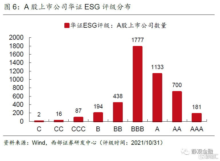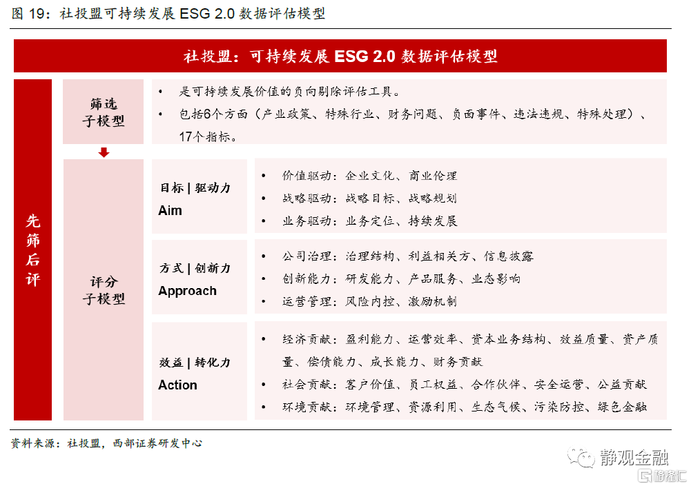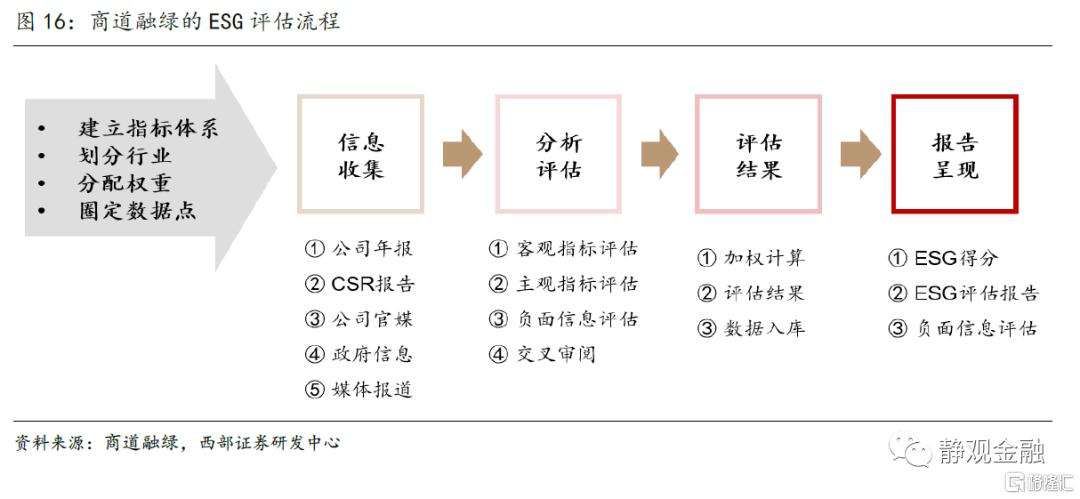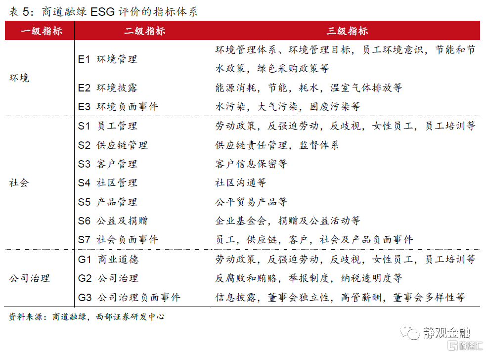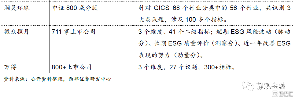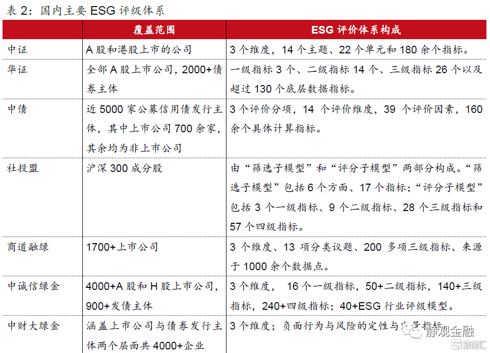 中证:覆盖A股和港股上市的公司;包括3个维度、14个主题、22个单元和180余个指标。ESG指数开发方面国内领先。华证:覆盖全部A股上市公司、2000+债券主体;评价体系包括ESG评级、ESG尾部风险两部分;具有AI驱动的大数据引擎。中债:主要针对发债主体,评级覆盖国内债券市场约5000家公募信用债发行主体,其中上市公司仅占约13%。商道融绿:覆盖全部A股上市公司,根据不同行业ESG实质性因子加权计算。社投盟:国内最早推动公司可持续发展价值评估和应用的先行者,评估分“筛选子模型”和“评分子模型”两步骤。此外,还有润灵环球RKS、中诚信绿金、中财大绿金、万得ESG、微众揽月ESG等。