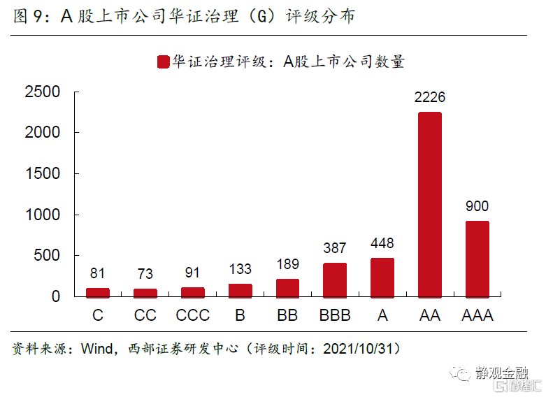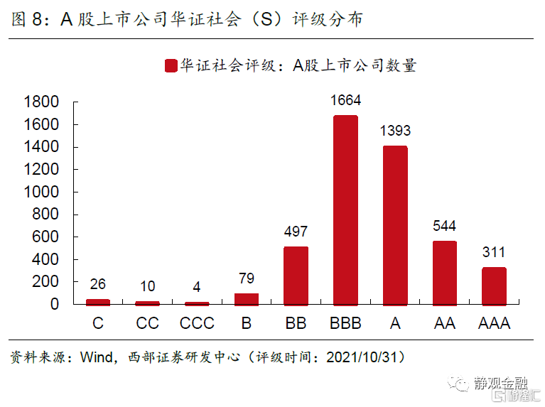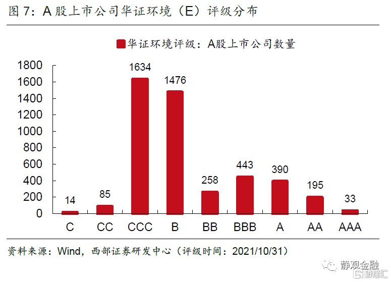 A股公司的华证ESG评级大多分布于BB-AA等级;三个分项中治理评级(G)表现最好,环境评级(E)最差。华证ESG最近一次评级为2021年10月31日,如下图6-图9,ESG总分BBB级(39.2%)、A级(25.0%)、AA级(15.5%)、BB级(9.7%)的公司数量占比靠前。环境评级中,CCC(36.1%)和B(32.6%)级别的公司占比最多;社会评级中,BBB(36.7%)和A级(30.8%)级别占比较多;治理方面A股上市公司评级表现较好,分别有19.9%、49.2%的公司被评为最高两个级别AAA和AA。