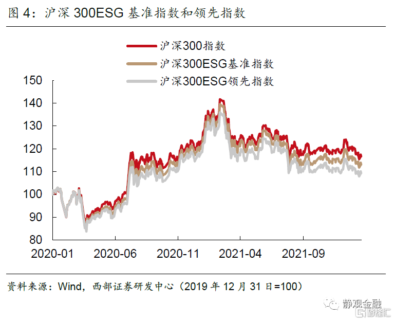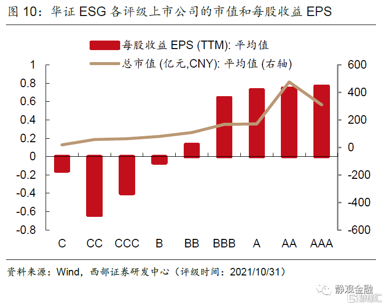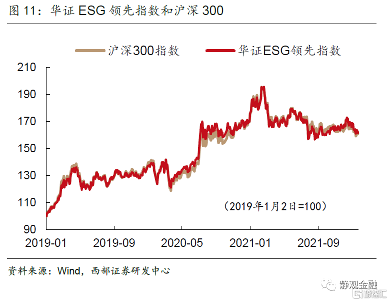 华证ESG评级表现好的公司大多总市值、每股收益EPS更高。如图10所示,AAA级、AA级的上市公司总市值分别平均为311亿元、476亿元,每股收益EPS分别为0.77和0.75。相比之下,评级为C-CCC的公司平均市值为62亿元,平均每股收益-0.43。华证公司基于其ESG评价结果编制了一系列ESG相关指数,例如华证ESG领先指数,剔除具有明显尾部风险的股票后再根据ESG评分等指标选出300只A股作为样本,截至2022年1月20日,该指标自2019年以来累涨62.7%,与沪深300的涨幅62.4%基本持平。