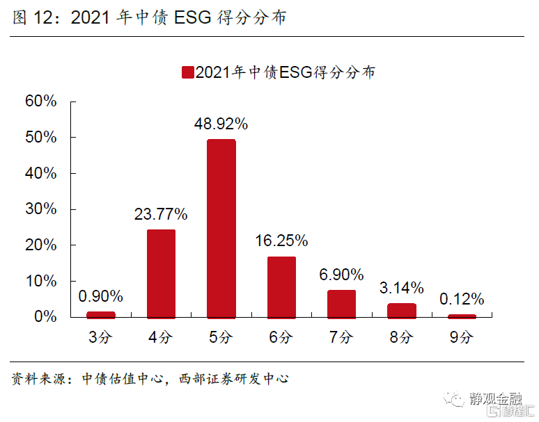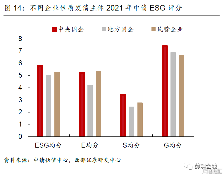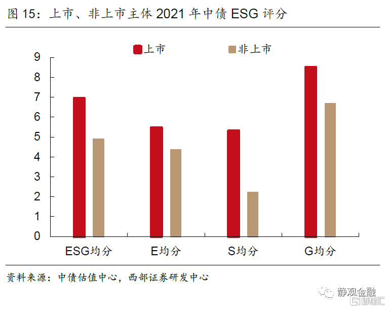 根据中债ESG数据,2021年发债主体ESG得分均介于3-9分,得分在4-5分的主体占72.7%;2021年平均5.14分,较2020年的5.08分小幅改善。中央国企表现优于其他性质企业,中央国企、地方国企、民营企业的ESG得分分别为5.80、5.02、5.23。评级样本中上市公司ESG均分6.93,显著优于非上市公司的均分4.89。
