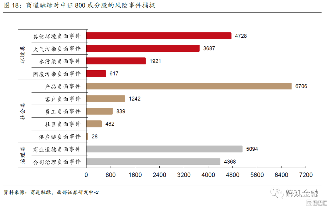 2020年全部A股4138家上市公司中,B等级及以上的公司共588家,占比约14%;没有公司为D评级。若单看中证800成分股在2018-2021年融绿ESG评级,呈现出好转趋势,如图15,评级分布向高等级移动,B等级以上的公司数占比从24%升至50.75%。从商道融绿捕捉的A股上市公司风险事件上看,如图16,国内上市公司的产品负面事件最多,2012年7月至2021年6月期间共6706件;其次为商业道德负面事件5094起。