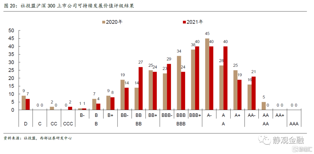 从2021年社投盟对沪深300上市公司的可持续发展价值评级结果看,大部分公司的评级分布在BB-至AA-,评级为B、BB、BBB、A、AA级别的公司分别有13家、65家、93家、99家、21家;整体水平和2020年相似。另外社投盟从2017年开始发布“义利99”榜单,从沪深300成分股中选出99家可持续发展价值最高的公司。2021年排名前五的公司为隆基股份、中兴通讯、汇川技术、国电南瑞、中国建筑。社投盟以“义利99”榜单为基础编制“义利99指数”,在2020年和2021年表现均不及沪深300指数。2020年义利99上涨17.8%而沪深300上涨27.2%;2021年义利99下跌6.9%而沪深300下跌5.2%。
