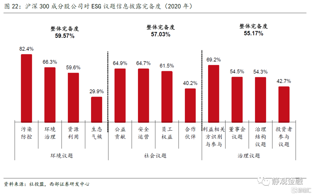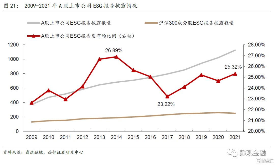 根据商道融绿统计的A股ESG信息披露情况,截至2021年6月底有26%的A股上市公司发布了2020年度ESG报吿,沪深300成分股中有83%披露了2020年度ESG报吿。2009年至2021年,A股市场披露ESG报吿份数保持增长,2021年有1125家公司发布了2020年度ESG报吿,比前一年增加104份。但是A股公司发布ESG报吿的比例在最近10年呈波动态势,未有显著提升,如图19所示,最高曾在2014年达到26.89%,最低在2017年降至23.22%,2021年回升至25.32%。根据社投盟统计,2020年沪深300上市公司对环境、社会、治理的非财信息披露完备度分别为59.57%、57.03%、55.17%。沪深300公司对生态气候、合作伙伴方面的信息披露较少。